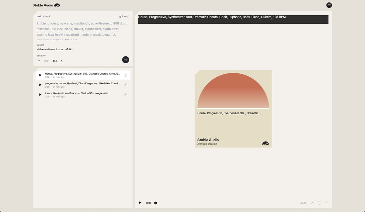 Stable Audio could be useful for creating background tunes for podcasts or videos, but we tested it and it can also handle different music genres, like house and trance, similar to the tracks by Armin Van Buuren, which you can listen below.