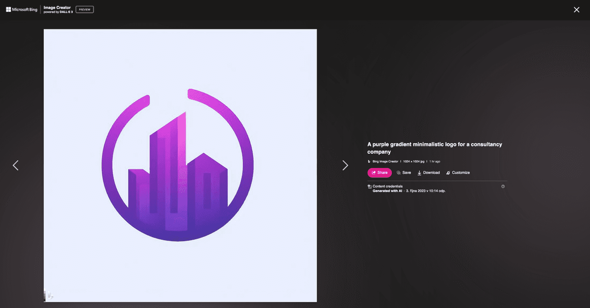 If you are happy with a generated result, you can simply click on the preferred image and hit the download button. You can also tweak it, using Customize button. It takes you to MS Designer where you can create different graphic content with your new logo.