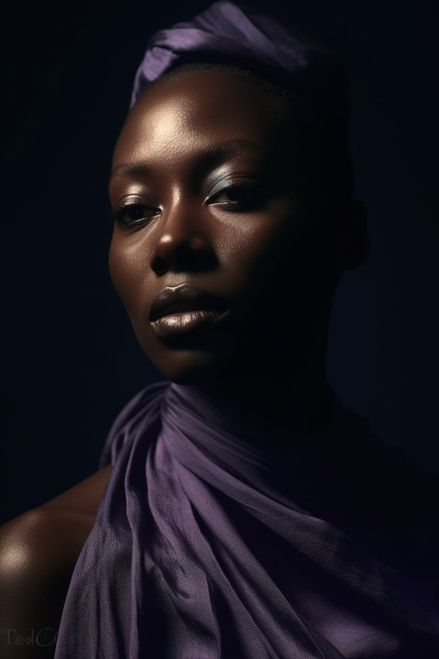 a woman with a purple cut is posing for a picture, in the style of light bronze and indigo, 32k uhd, black arts movement, studio portraiture, urban edge, close-up, poetcore --ar 2:3 --s 750 --style raw