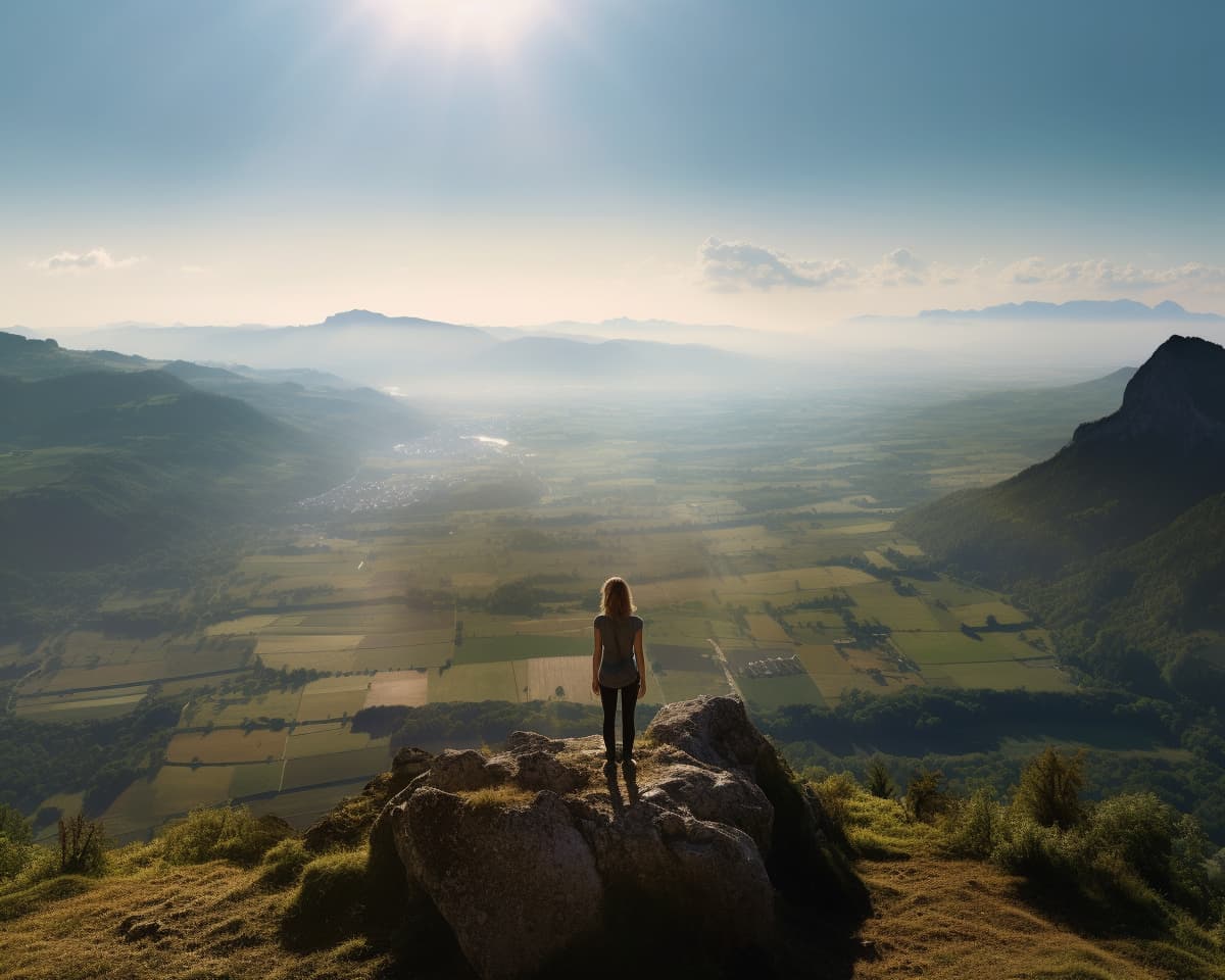a woman standing on a mountain overlooking valleys, in the style of solarizing master, christian griepenkerl, uhd image, the düsseldorf school of photography, cabincore, panorama, pentax 645n --ar 5:4 --style raw