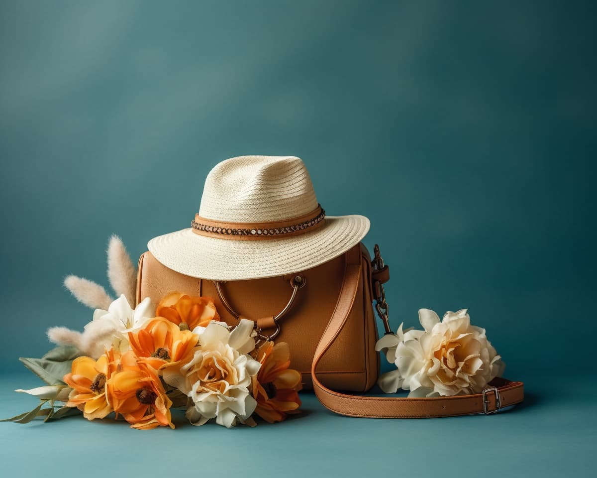 a straw hat on top of an empty purse with flowers, in the style of light gold and light amber, pop-culture-infused, konica big mini, light navy and light brown, modern jewelry, delicate flora depictions, leather/hide --ar 5:4 --s 750 --style rawIllustration