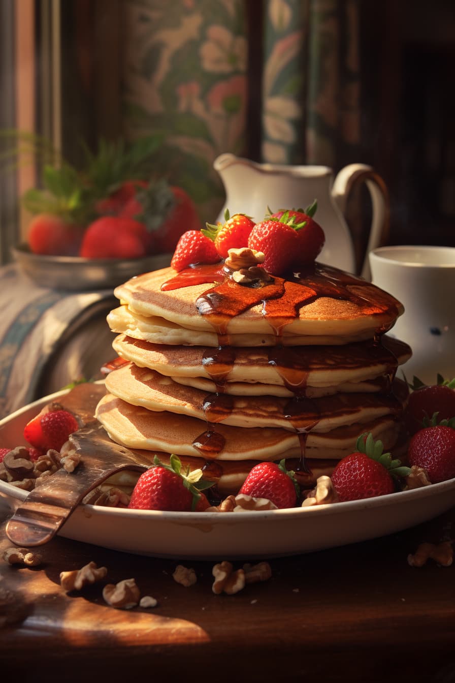 strawberry pancakes with nuts, in the style of fujifilm xf 35mm f/1.4 r, 32k uhd, steve henderson, industrial-inspired, piles/stacks, authentic details, y2k aesthetic --ar 2:3Fashion & Beauty