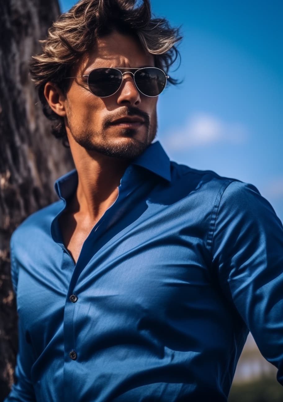 a man wearing sunglasses and a blue shirt is posing outdoors, in the style of elegant clothing, cabincore, light silver and black, happycore, félix labisse, exacting precision, exotic --ar 160:227 --s 750 --style raw