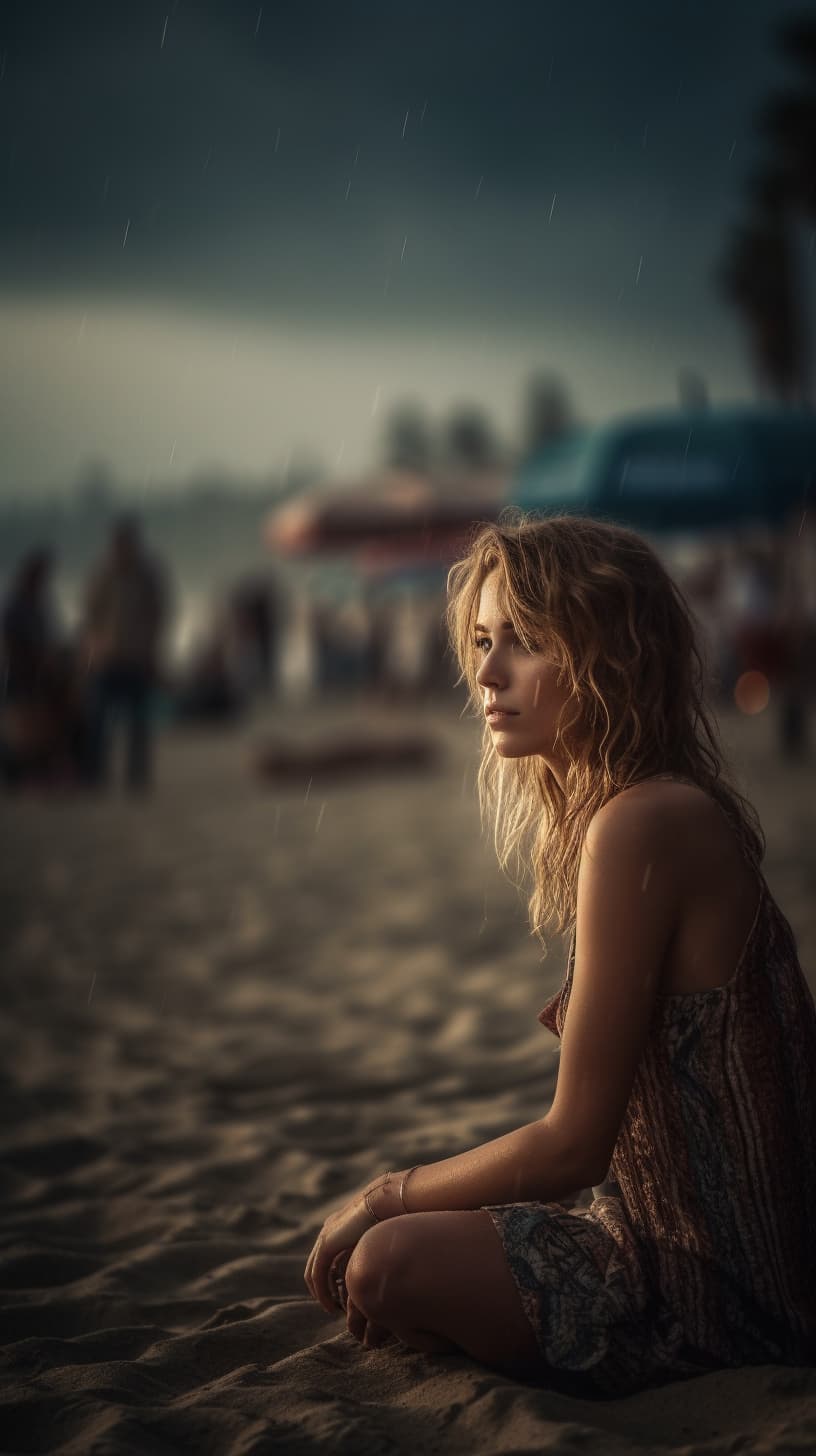 beautiful young woman in bikini sitting at the beach in santa monica during light rain with sun behind clouds--no people in background -s 1000 --ar 9:16