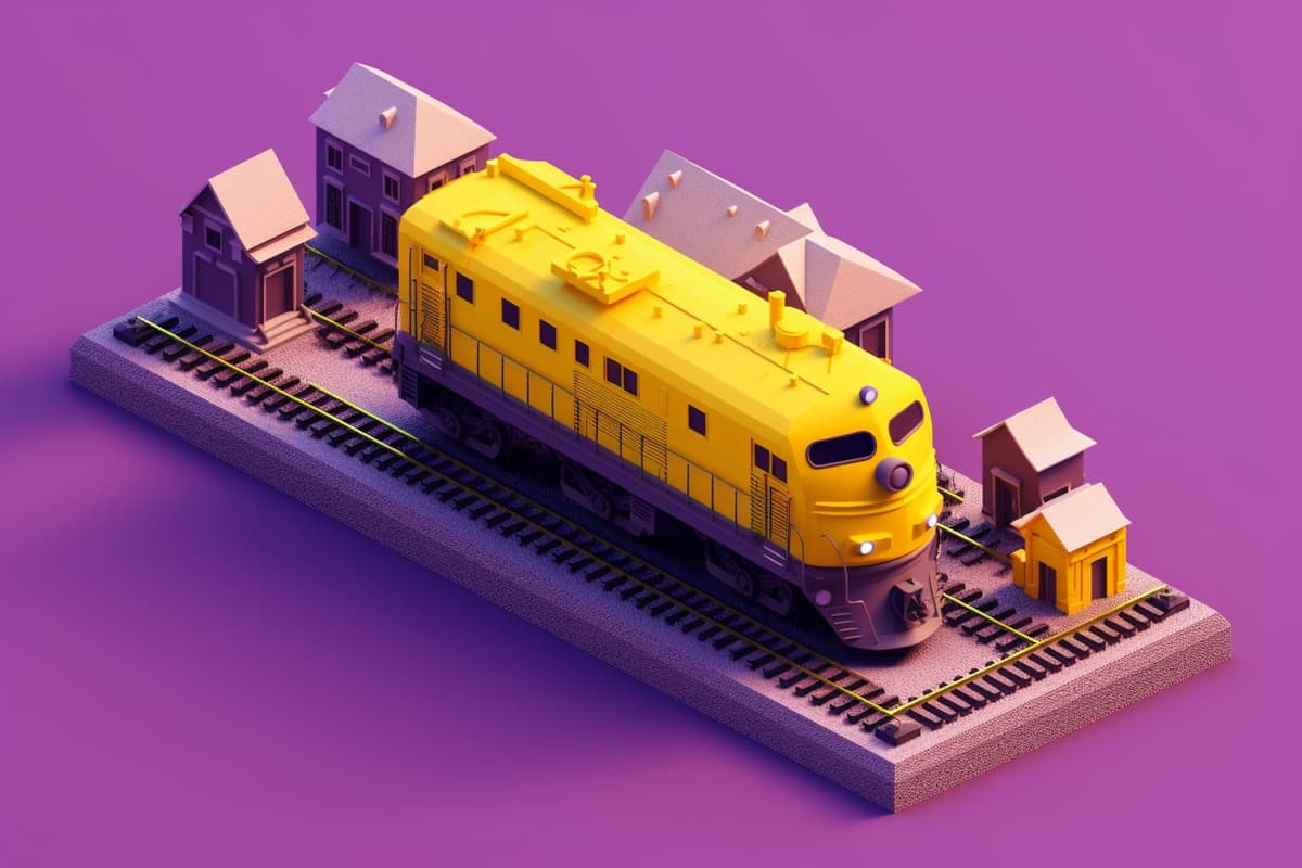 a violet train jumps out the huge iPad, yellow background, in the style of minimalistic abstract compositions, violet and yellow, isometric view, aerial photography, installation-based, cinestill 50d, oriental minimalism, isometric --ar 3:2Animals