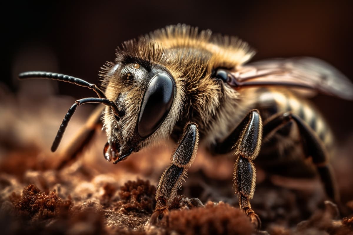 A photograph capturing the intricate details of a bee at close range, with its fuzzy body and delicate wings perfectly in focus. The use of a shallow depth of field emphasizes the impressive texture and patterns of its body while the blurred background adds a sense of context and depth. The careful use of light highlights the natural beauty of the scene, while the bee's crystal-clear eyes and feather-light wings add to the overall sense of wonder and awe --ar 3:2 --s 750