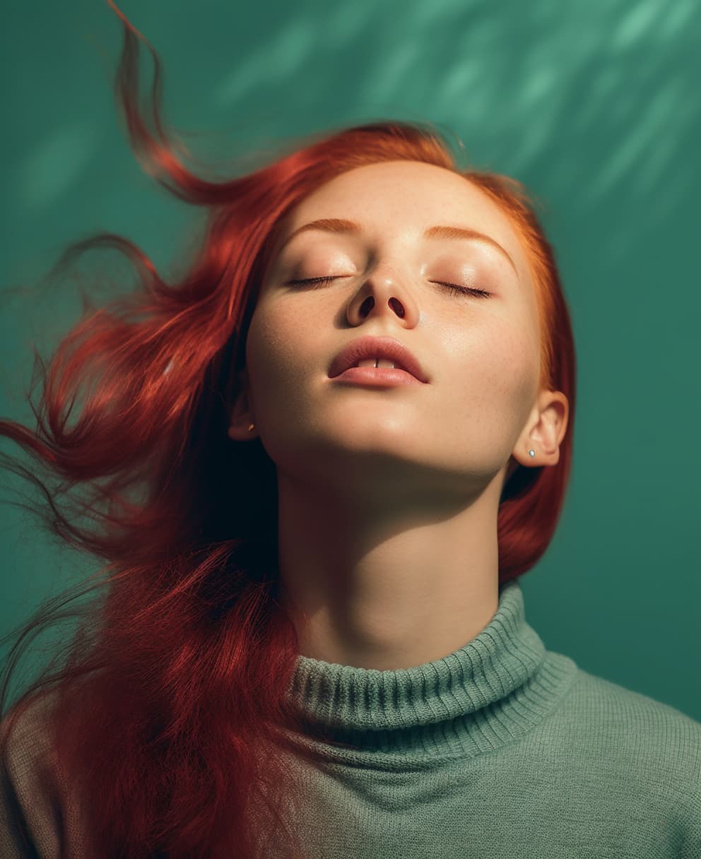 beautiful red haired woman posing with eyes closed on green background, in the style of light teal and dark pink, expressive eyes, light gray and dark aquamarine, close-up intensity, dark pink and sky-blue, sony alpha a7 iii, photorealistic pastiche --ar 40:49 --s 750 --style rawPhotography