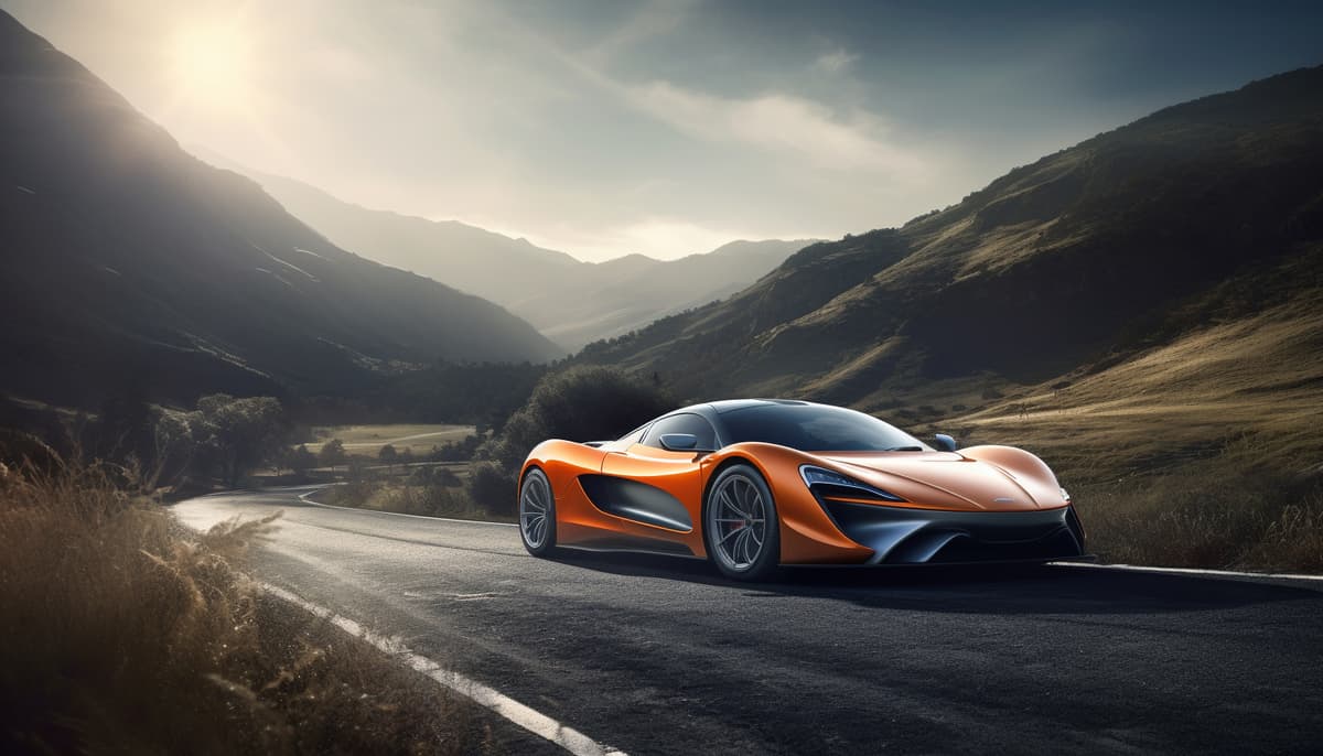 A photograph capturing the sleekness and innovation of a futuristic McLaren supercar, speeding along a winding mountain road that showcases the natural beauty of the surrounding landscape. The use of a high-speed shutter and strategic composition emphasize the speed and agility of the car, while the mountains in the background add depth and context. The careful use of light and shadows highlights the curves and contours of the car, emphasizing its unique design. --ar 7:4 --s 500