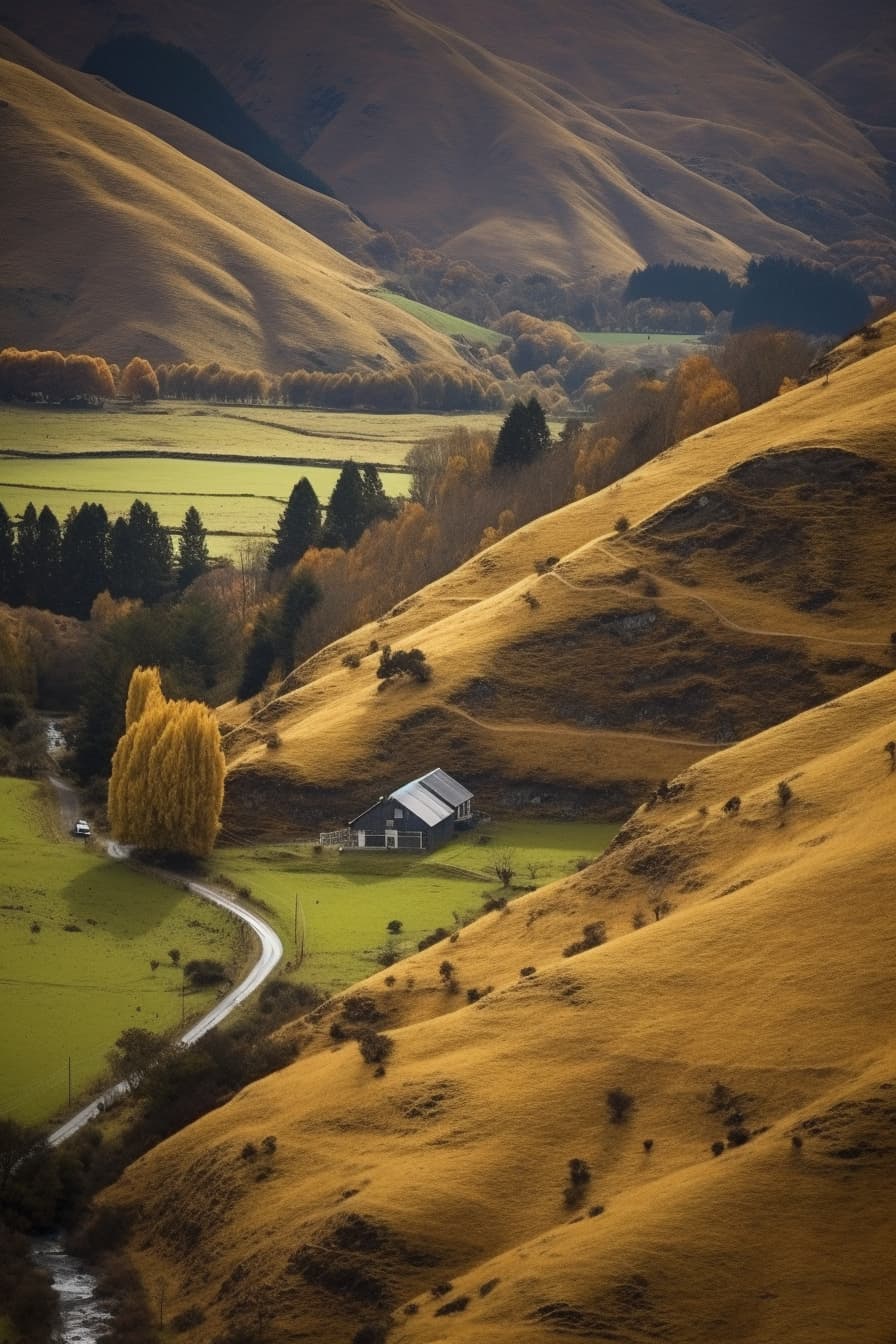 a mountain with a hillside, in the style of zeiss milvus 25mm f/1.4 ze., dark white and amber, rural life scenes, kinetic lines and curves, metropolis meets nature, transportcore, maori art --ar 2:3 --s 750 --style raw Logos, Icons