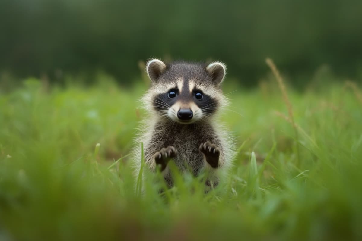 raccoon baby standing in the grass, in the style of depiction of animals, darkly comedic, forced perspective, soft-focus technique --ar 3:2 --s 250 --style raw Food & Drink