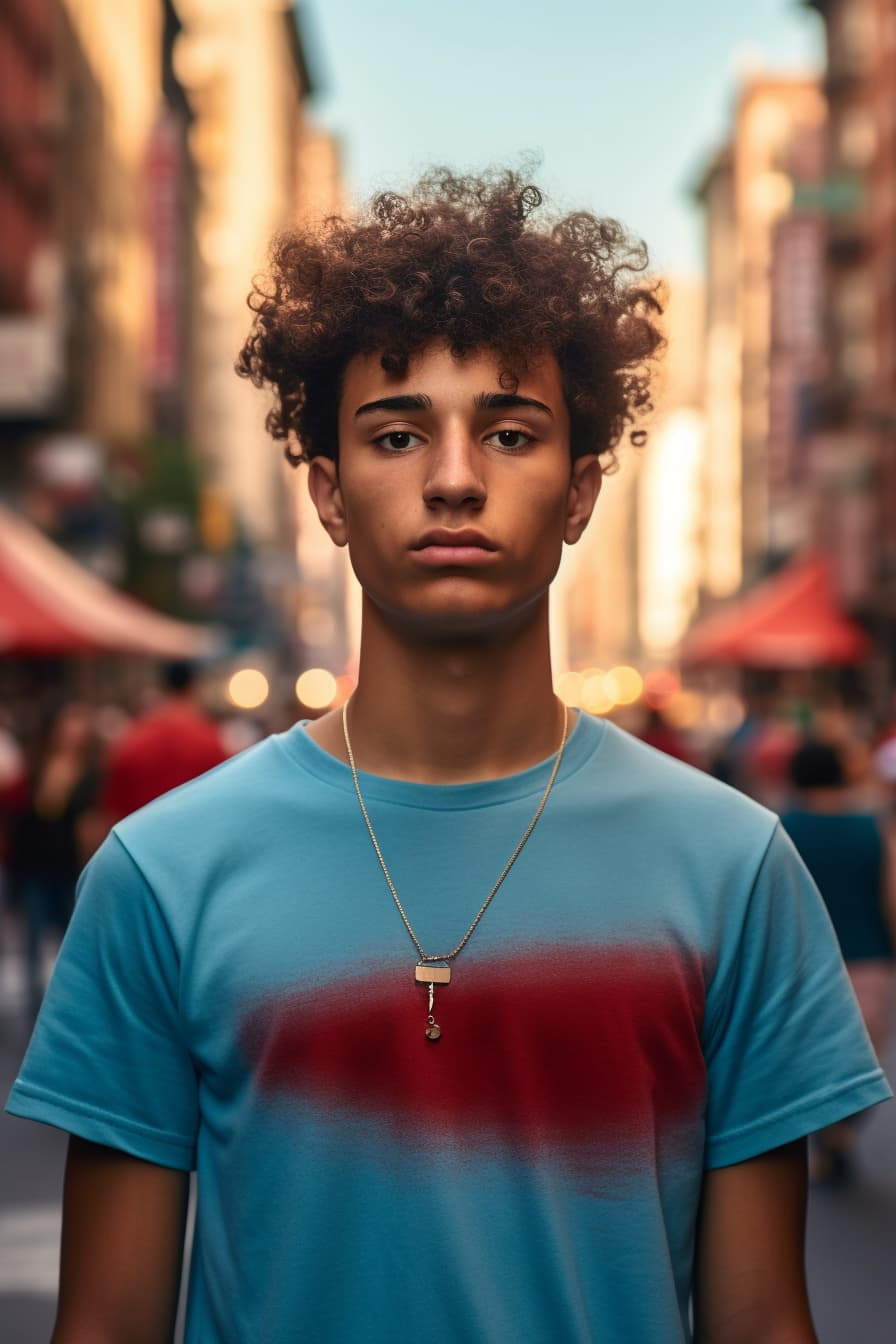 young man with curly hair in front of a city, in the style of hannah yata, balcomb greene, new american documentary photography, light blue and red, strong facial expression, new york school, dappled --ar 2:3 --s 750 --style raw