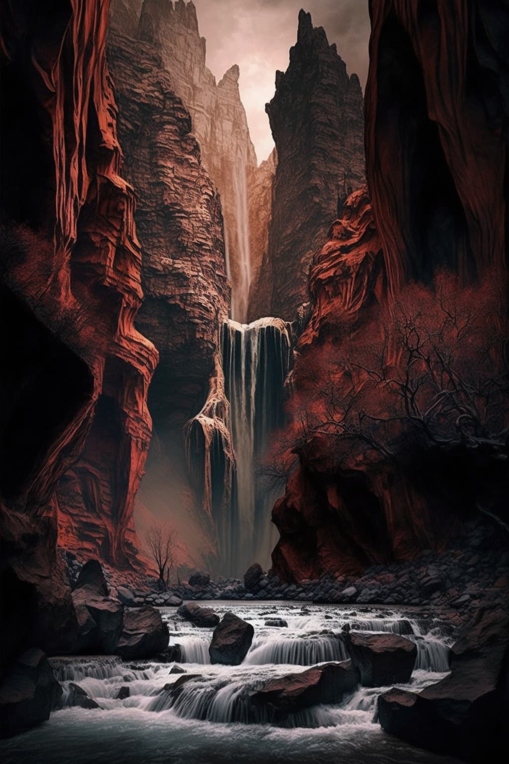 a waterfall in a rocky canyon near a river, in the style of i can't believe how beautiful this is, midwest gothic, photography installations, mesmerizing colorscapes, photographic weavings, urban fairy tale, dark red and light brown --ar 2:3 --s 750
