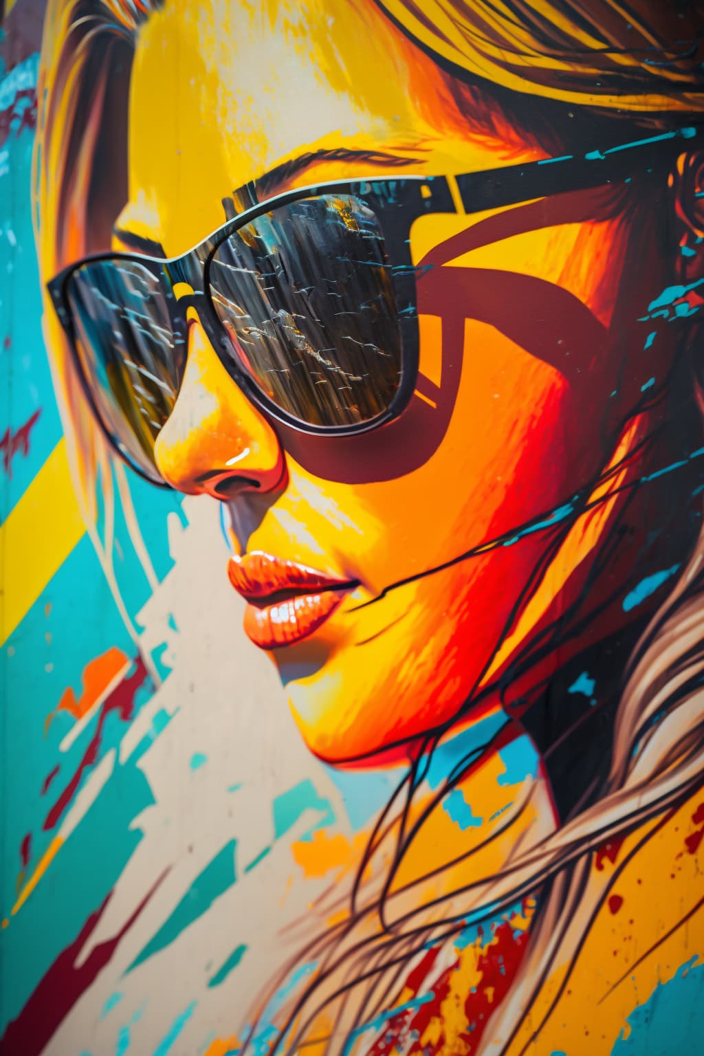 a painting of a woman wearing sunglasses, in the style of urban graffiti, nikon d850, close up, mural painting, chrome reflections, flickr, tamron sp 70-200mm f/2.8 di vc usd g2 --ar 2:3 --v 4 --s 250Landscapes