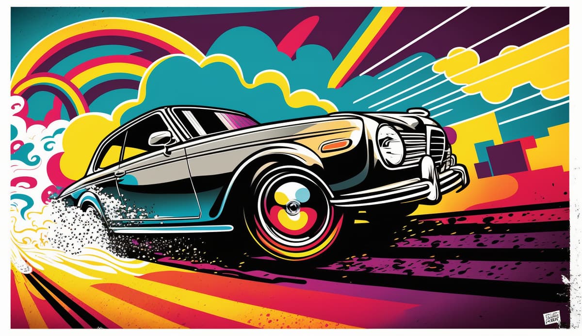 An energetic and vibrant image featuring a BENZ car depicted in a comic book style. The illustration portrays the sleek and stylish design of the car with exaggerated lines, bold colors, and dynamic angles. The composition captures the sense of speed and excitement, as if the car is bursting out of the comic page. Whimsical sound effects and speech bubbles add to the playful and lively atmosphere. Artwork, digital illustration, bold colors and thick outlines, --ar 16:9 --v 4 --s 250