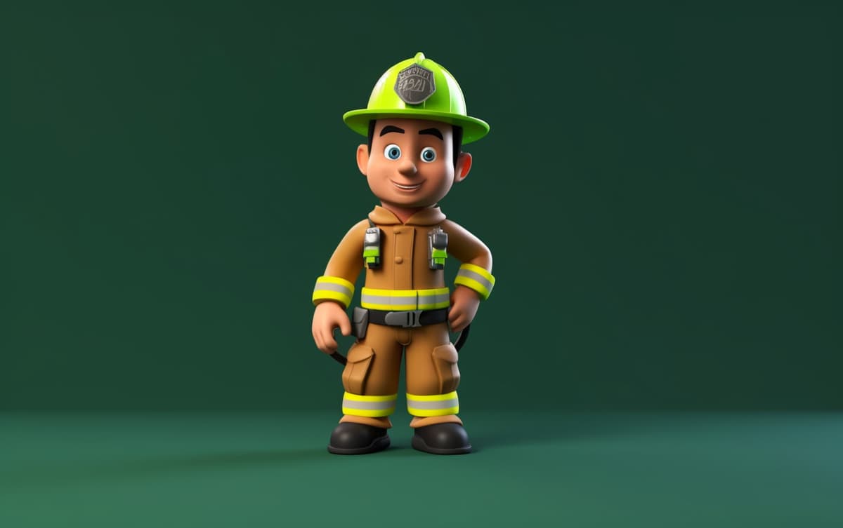 a fireman 3D cartoon character with green background captured by Canon R6, realistic detail of depth --style raw --s 1000 --ar 16:10