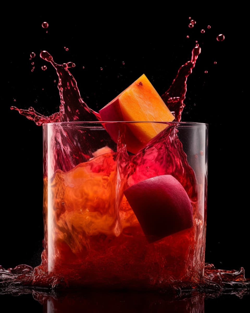 splash juice and iced cube. food photography 1 medium beet (rinsed, lightly peeled and quartered) 1 medium apple (peeled, cored and quartered) 1 Tbsp size piece of fresh ginger (skin removed) 3 whole carrots (rinsed and peeled) Place all ingredients in a blender and blend until smooth, adding a splash of apple juice if needed to get it moving. --ar 4:5 --s 500