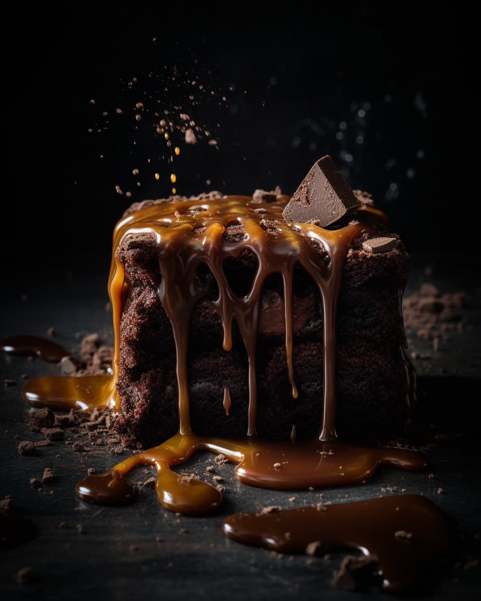 a dessert of brownie and dark chocolate covered with caramel, in the style of fluid photography, playful yet dark, photo taken with provia, frogcore, iconic, staged photography, poured --ar 4:5 --s 750