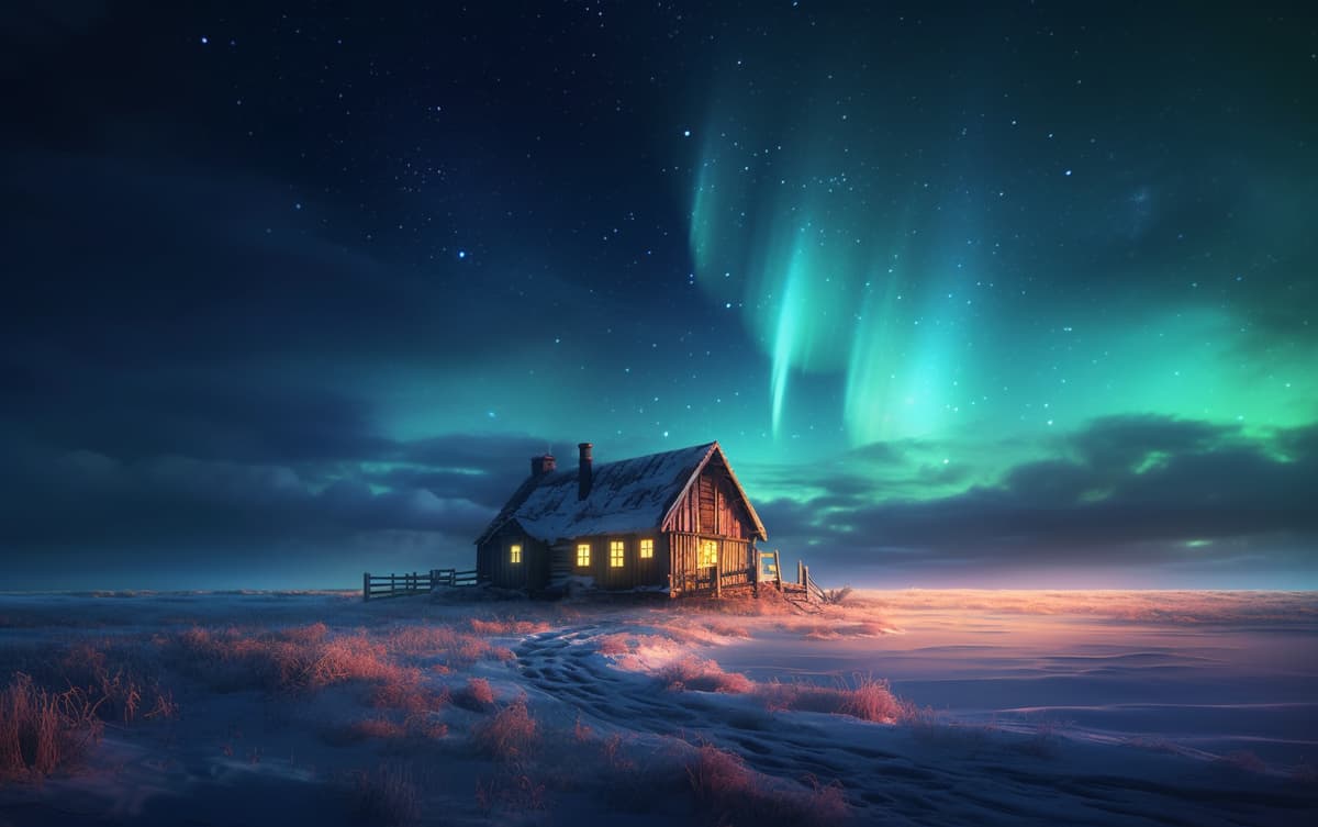 an aurora in sky, a cabin in the middle of a snowy field, a detailed matte painting by Max Dauthendey, glowing lights, volumetric lighting, nightscape --ar 16:10