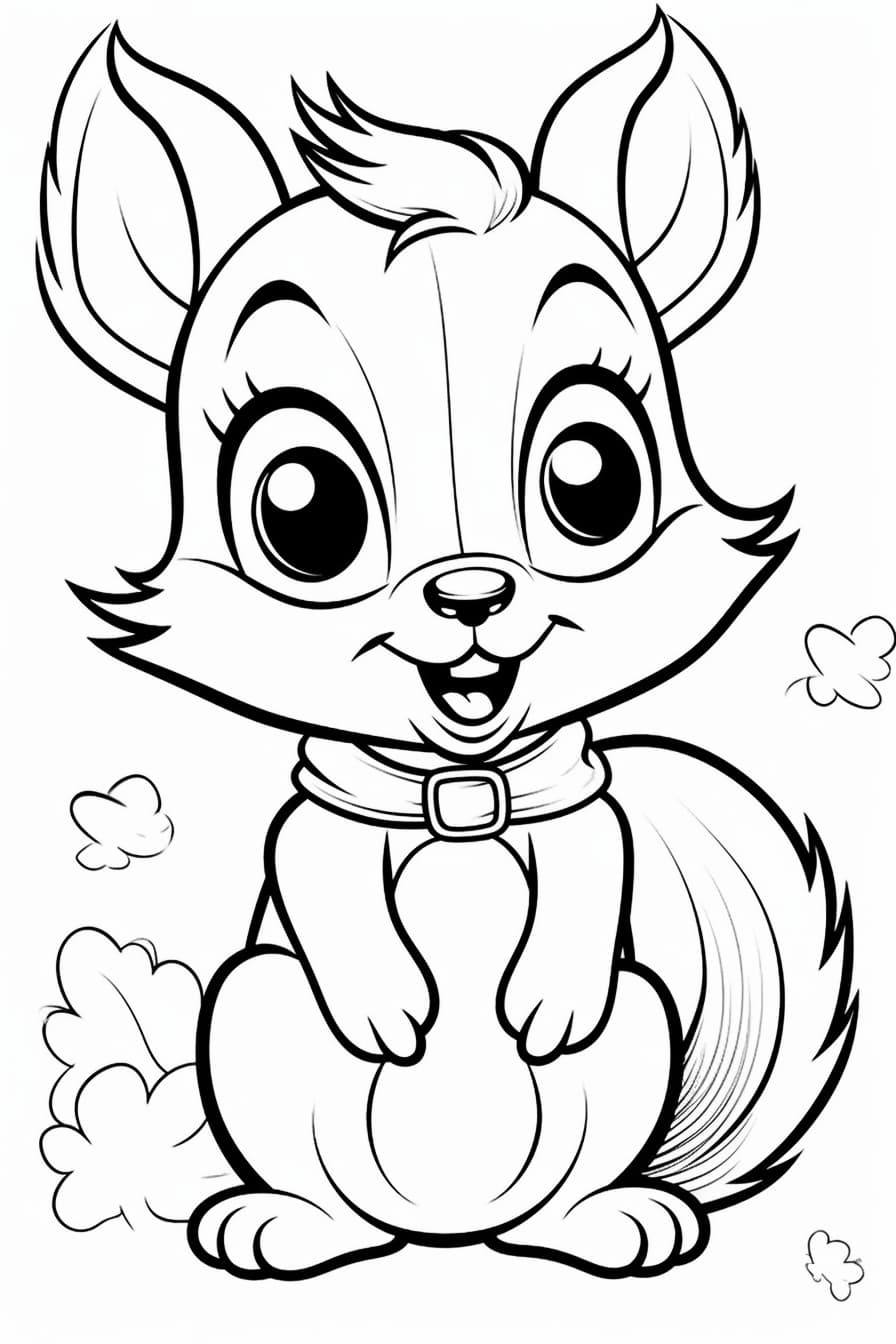 black and white coloring page for kids very cute, squirrel with big eyes smiling, low detail, clean line art, --ar 2:3 --s 250 --style raw