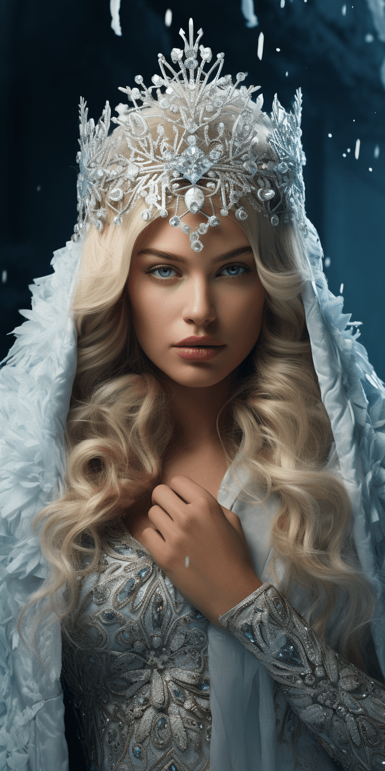 hyper realistic mid body portrait of a snow queen wearing a crown made out of ice, snowflakes design on her face, snowy landscape, away from camera, incredibly high detailing, high resolution, very realistic, vibrant colors, beautiful lighting, --ar 3:6 --v 5.2 --s 250