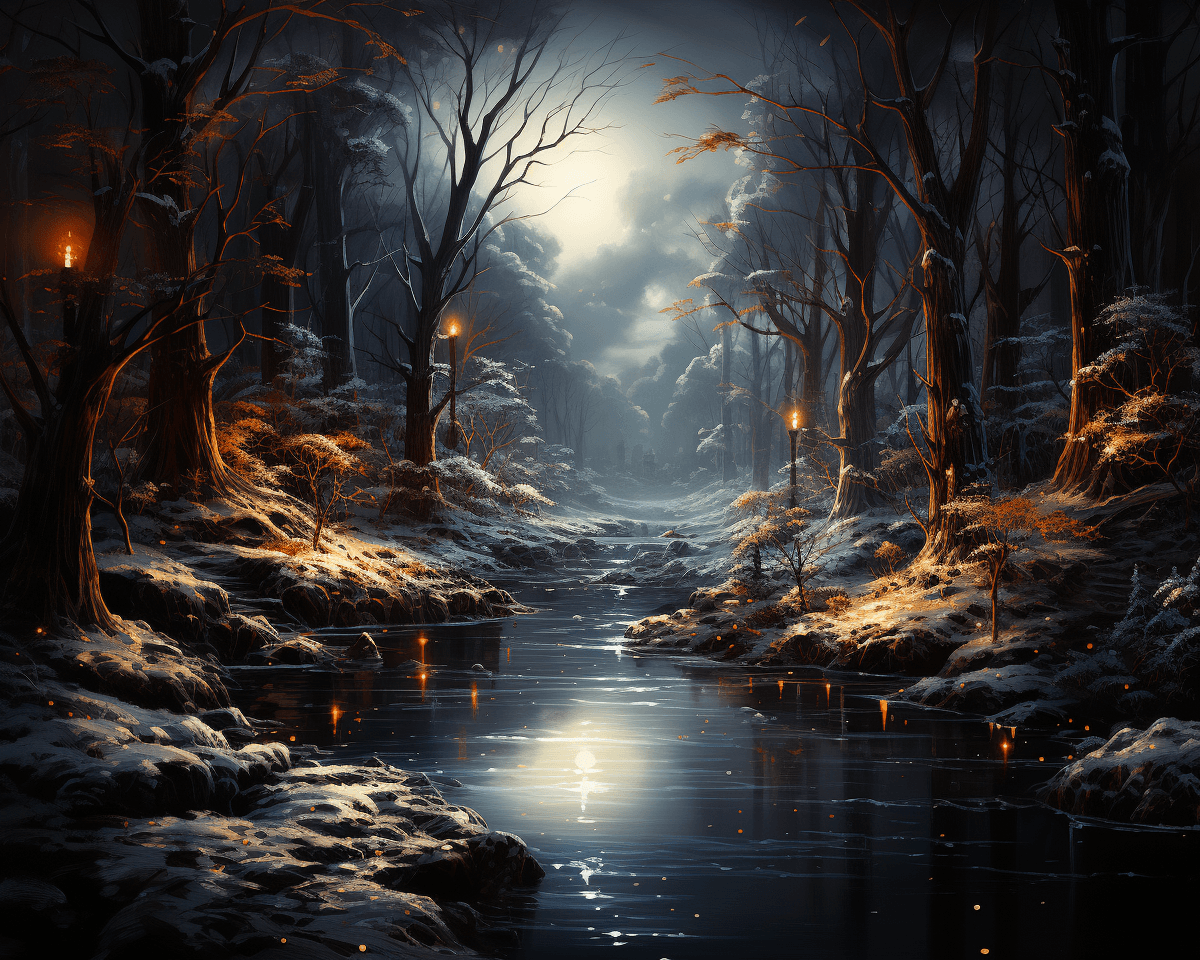 the magical scenery of the winter solstice. A magical forest in winter. --ar 5:4 --s 750 --v 5.2