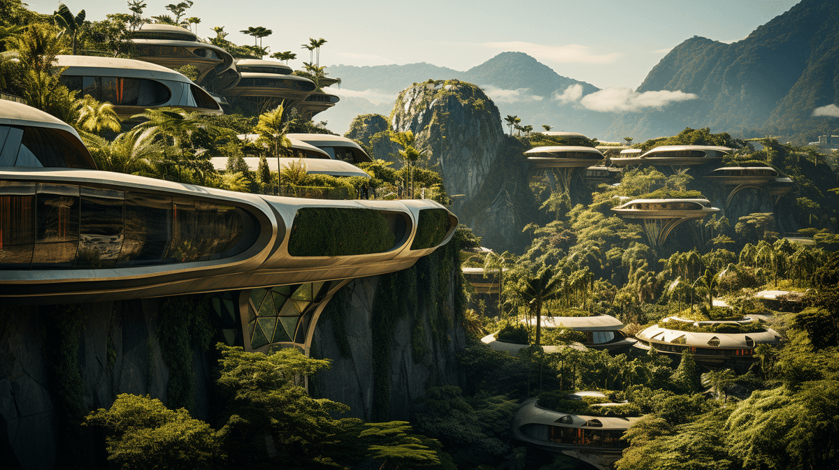Nikon Z9 photo, jungle city with nature, stylistic archietecture buildings that blend into the mountains, --ar 16:9 --v 5.2 --s 250