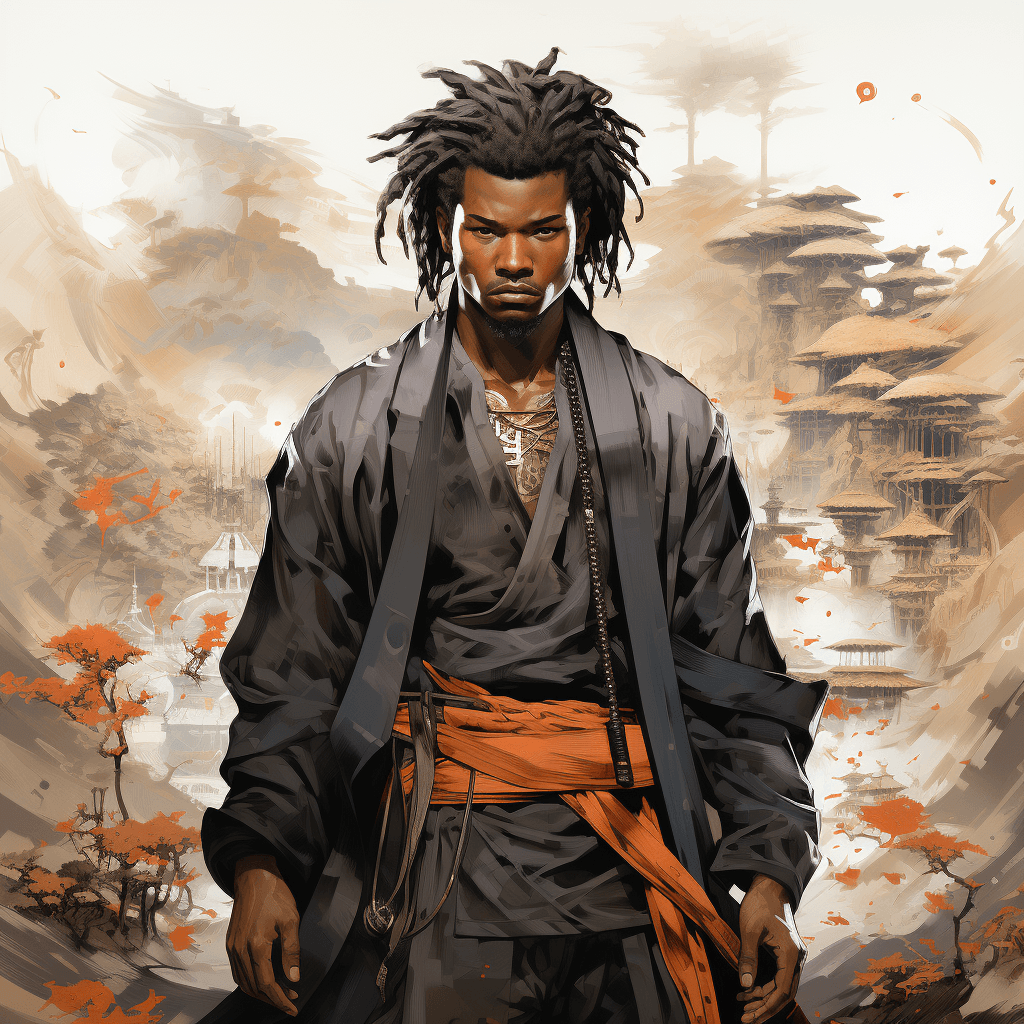 A grand arena filled with spectators, the focus on Onyx, his silhouette dark against the light, his brown skin contrasting with the shadows he controls. His sword and daggers poised for battle. His armor, a blend of samurai and tactical modernity, seems to absorb the light around him. in a 2D amine style --s 750 --v 5.2