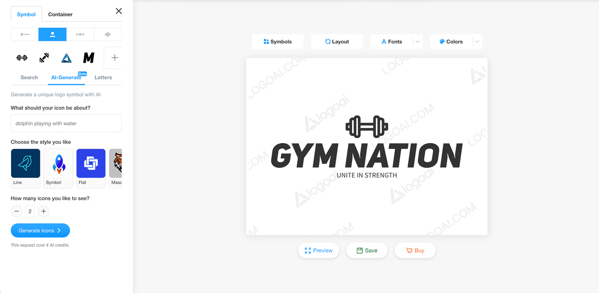 There is also an Icon generator where you can generate a symbol for your logo or icon for your app. However, this is not free and you need to purchase the Brand Tier in which 100 AI credits are available. Each generation of a symbol or icon costs 2 credits.
