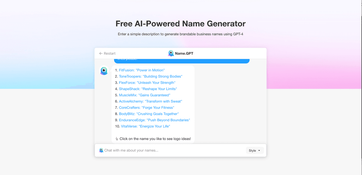 Apart from logos and visual identities LogoAI also thinks of users who have absolutely nothing, neither a name nor an idea. In the first case, there is a free Name Generator in which you describe your business and name style and it will generate 10 names for you business.