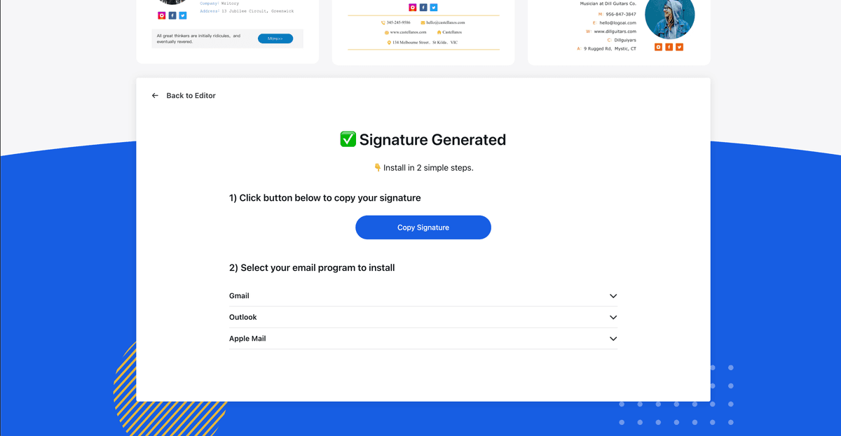 And last but not least, there is the Email signature generator in which you can choose from 12 templates and customize your signature. An email signature is then generated. The good touch is a tutorial on how to embed signatures in Gmail, Outlook and Apple Mail. Just beware, as with all email signatures, some templates don't work quite right in dark mode.